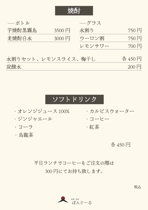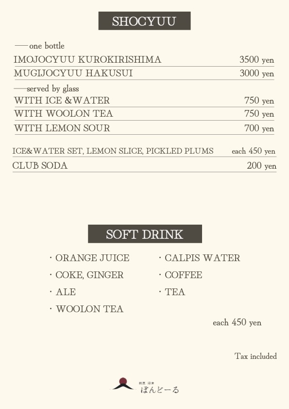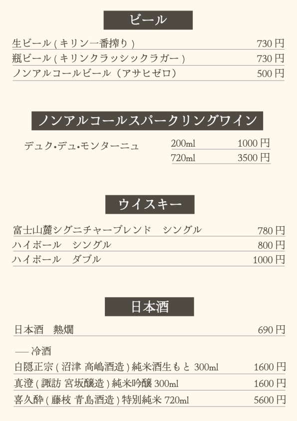 富士山の湧き水から作られた地酒(白隠正宗、喜久酔 等)を若竹の徳利にてお楽しみ頂けます。又ノンアルコール飲料(ビール、スパークリングワイン 等)も各種取り揃えております。